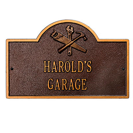 American-Made Personalized 2-Sided Workshop Sign With Saw Bracket In Cast Aluminum