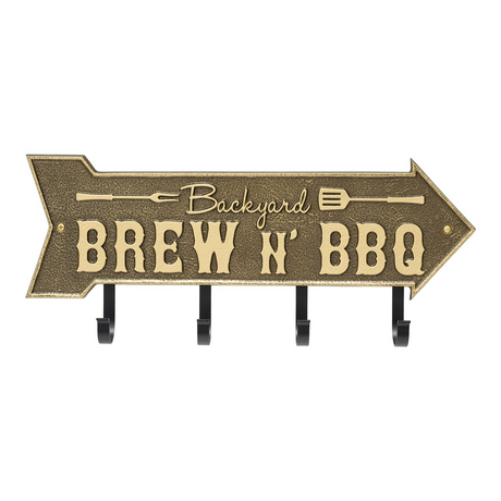 Backyard Brew N' BBQ Arrow Hook Plaque, Antique Brass
